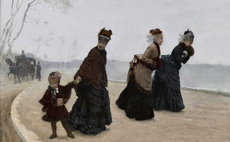 dell’abbigliamento o degli scenari parigini come nel quadro Che freddo, tre signore e una bambina,