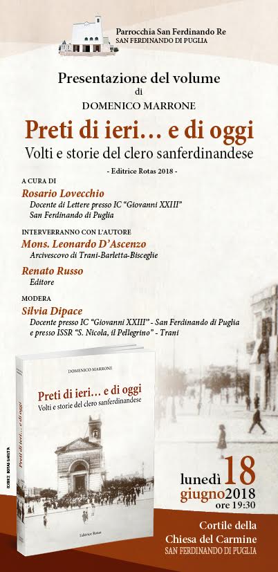 Lunedì 18 giugno 2018, a San Ferdinando di Puglia, nel cortile della Chiesa del Carmine, alle ore 19.30, si terrà la presentazione del volume di Mons. Domenico Marrone “Preti di ieri … e di oggi. Volti e storie del clero sanferdinandese”, Editrice Rotas 2018